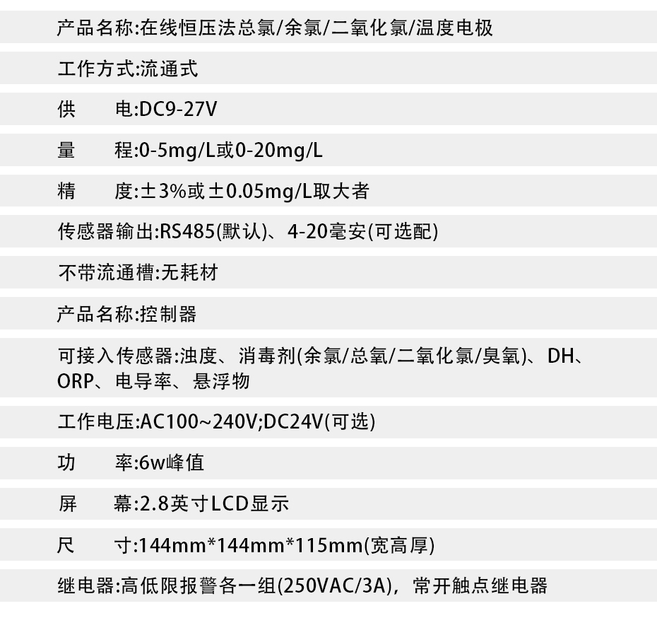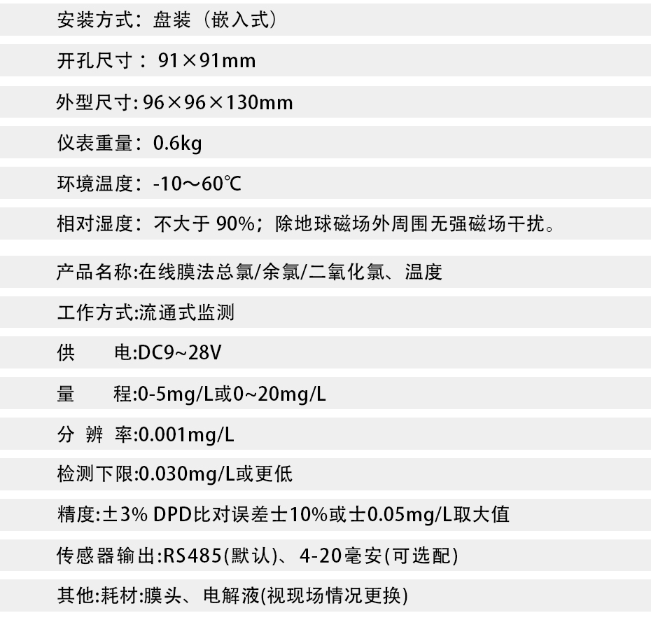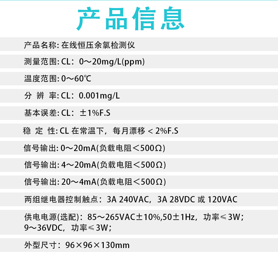 水質(zhì)余氯在線測(cè)控儀,即水質(zhì)在線余氯計(jì),是采用非膜式恒電壓傳感器,無須更換膜片與藥劑,靈敏度高,信號(hào)響應(yīng)迅速,測(cè)量準(zhǔn)確、性能穩(wěn)定、維護(hù)簡(jiǎn)單。該水中余氯測(cè)控系統(tǒng)具有使用方便、準(zhǔn)確度高、經(jīng)濟(jì)的特點(diǎn)。運(yùn)用這一系列的分析技術(shù),確保儀器長期工作的穩(wěn)定可靠性和準(zhǔn)確性。具有中文菜單式操作、485通訊等功能。